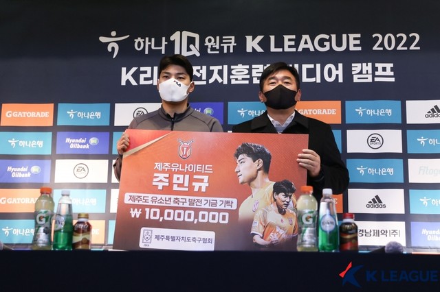 주민규는 12일 오전 10시 ‘K리그 전지훈련 미디어캠프’에서 주민규는 제주도유소년축구발전기금 1,000만 원을 제주특별자치도축구협회(회장 윤일)를 통해 기부했다. 2021 K리그 대상 시상식에서 최다 득점상(22골)과 베스트 11 공격수 부문에 이름을 올리며 2관왕을 차지했던 주민규는 자기 자신을 지금의 이 위치까지 있게 해준 제주에 감사하며, 축구 발전을 위해 상금과 더불어 자비를 더해 기부금을 전달했다.
