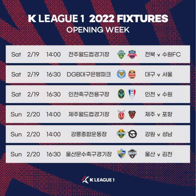 전북과 수원 FC의 공식 개막전은 2월 19일 오후 2시 전주 월드컵경기장에서 열린다. 같은 날 오후 4시 30분 DGB대구은행파크에서는 대구 FC와 FC 서울, 인천 전용경기장에서는 인천 유나이티드와 수원 삼성의 경기가 열린다.