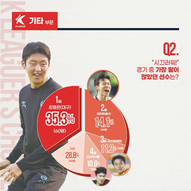압도적 득표율로 대망의 1위에 오른 선수, K리그 팬이라면 모두가 아는 최영은이다. “라인업! 라인업!” 끊임없이 비명을 지르며 수비진을 정돈한다. 이 때문에 ‘고라니’라는 별명이 붙기도 했다. 사실 최영은은 억울할 법하다. 골키퍼이기에 당연히 상대 필드 플레이어들과 접촉할 기회가 적고, 상대가 그의 말을 들을 확률도 낮다. 그런데도 가수 나얼 뺨치는 압도적 성량으로 스타디움을 장악하는 바람에 ‘말 많은 선수’가 됐다. 2~4위 선수들의 공통점은 투쟁심이다. 유독 큰 승리욕으로 경기장을 휘젓는 선수들이 이름을 올렸다. ‘치타’ 김태환은 물론, ‘파이터’ 이찬동도 그렇다. 고요한 역시 한 열정 하는 선수다. 그런데 ‘고요’한이라는 ‘닉값’을 못하나보다. 2위부터 4위까지는 박빙이다. 2위와 3위가 5표 차이로 갈렸고, 3·4위 차이는 1표에 불과했다.