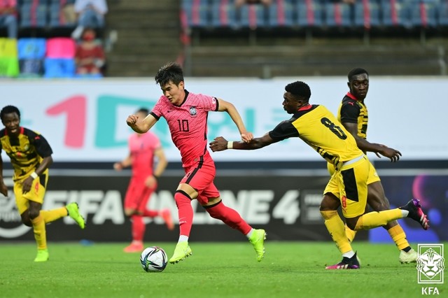 골문은 조현우가 지킨다. 최후방 포백은 우측부터 좌측으로 김태환·박지수·김영권·김진수가 위치한다. 중앙 두 명의 미드필더에는 백승호와 김진규, 2선 공격진에는 송민규·이동경·권창훈이 포진했다. 최전방 공격수에는 조규성이 낙점됐다.