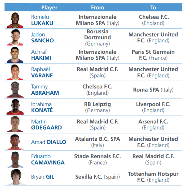 로멜루 루카쿠(이탈리아 → 잉글랜드), 제이든 산초(독일 → 잉글랜드), 아치라프 하키미(이탈리아 → 프랑스), 라파엘 바란(스페인 → 잉글랜드), 태미 에이브러햄(잉글랜드 → 이탈리아), 이브라히마 코나테(독일 → 잉글랜드), 마틴 외데가르드(레알 마드리드 → 아스널), 아마드 디알로(이탈리아 → 잉글랜드), 에두아르도 카마빙가(프랑스 → 스페인), 브리안 힐(스페인 → 잉글랜드)까지가 명단에 올랐다.
