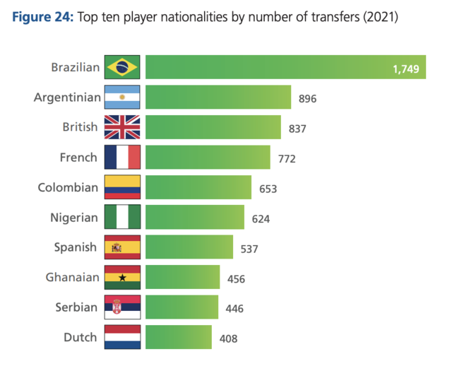 지난해에는 179개 국적을 가진 선수들이 국제 이적을 했다. 이중 상위 10개 국적 선수들이 전체 이적 시장의 40% 이상을 차지했다.