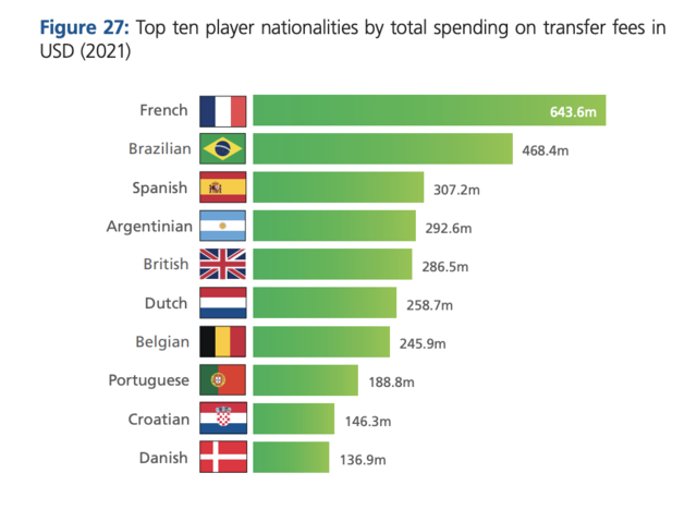 한편, 총 이적료 결과는 달랐다. 이적한 선수 수로는 4위를 기록했던 프랑스가 총 이적료 6억 4,360만 달러(약 7,665억 원)를 기록했다. 브라질은 이 지표에서 4억 6,840만 달러(약 5,578억 원)로 2위로 밀렸다. 이어 스페인, 아르헨티나가 뒤를 이었다.