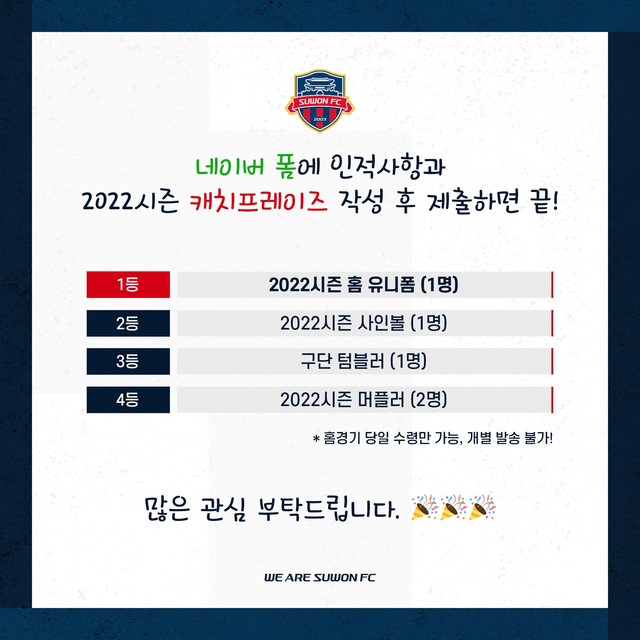 당선작은 수원 FC의 2022시즌 공식 캐치프레이즈로 사용되며, 공모자 중 추첨을 통해 2022시즌 홈 유니폼, 친필 사인볼, 머플러, 구단 텀블러 등을 제공한다.