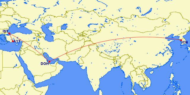 인천공항에서 출발했습니다. 카타르 도하에 도착해 터키 이스탄불로, 이스탄불에서 안탈리아로, 2번 경유해 이동했습니다. 비행 거리만 1만 339㎞였습니다.