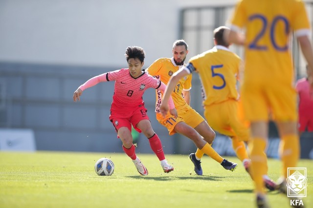 이날 경기서 벤투 감독은 4-1-3-2 포메이션을 기본 틀로 투톱을 실험했다. 조규성과 김건희가 최전방에 섰고, 송민규와 권창훈이 좌우 측면에, 김진규와 백승호가 중원에 서서 다이아몬드 형태를 구성했다. 4백은 김진수, 김영권, 박지수, 이용이 구축했으며, 골문은 김승규가 지켰다.