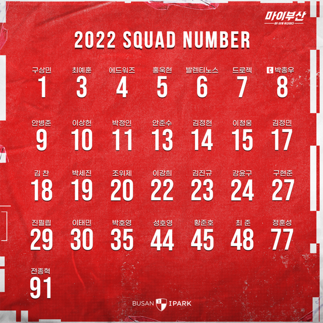 부산은 21일 정오 공식 SNS 채널을 통해 2022시즌 선수단의 배번을 발표했다. 팀을 이끌 주장 박종우는 8번을, 한국 축구 국가대표팀에서 좋은 활약을 펼치고 있는 김진규는 23번을 유지한다. 지난해 K리그2 득점왕과 MVP를 차지한 안병준도 지난 시즌과 마찬가지로 9번을 택했다