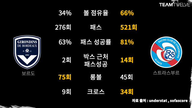 이런 예측은 꽤 정확했다고 할 수 있다. 실제 대결에서 양 팀의 볼 점유율은 34% 대 66%로 보르도는 공을 거의 점유하지 못했다. 패스 횟수는 거의 두 배가량 차이가 난다. 문제는 패스 성공률이다. 패스 횟수가 훨씬 적음에도 성공률은 63%에 그쳤다. 반면 스트라스부르는 81%의 성공률을 뽐냈다. 다만 보르도는 롱 볼 빈도가 많았다. 패스 항목에서 유일하게 상대보다 횟수가 많은 지표다. 보르도는 상대에게 점유를 내주고 롱 볼을 통해 역습을 노리는 축구를 펼쳤다. 페널티 박스 근처 패스 성공과 크로스 횟수를 비교해보면, 스트라스부르가 보르도를 소위 ‘가둬놓고 패는’ 경기를 한 것을 알 수 있다.