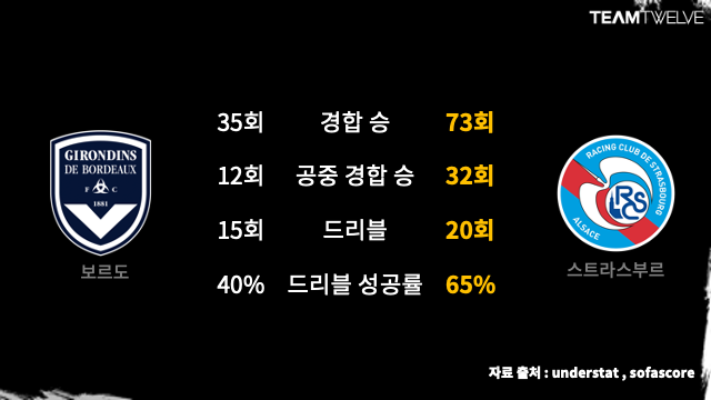 볼을 점유하고 패스하는 팀들은 상대방의 거친 도전을 견디어 내야 한다. 그러지 못하면 자칫 상대 팀에 역으로 당할 수 있다. 보르도와 스트라스부르의 경합 데이터를 보면 스트라스부르가 이런 경우를 사전에 차단하려 했다는 것을 알 수 있다. 전체 경합에서도 두 배 이상 많은 승리를 거두었으며, 공중은 아예 장악하다시피 했다. 드리블도 보르도가 시도 횟수가 적음에도 성공률이 더 낮은 것을 보면, 전반적으로 스트라스부르가 우월한 경기를 한 것을 알 수 있다.
