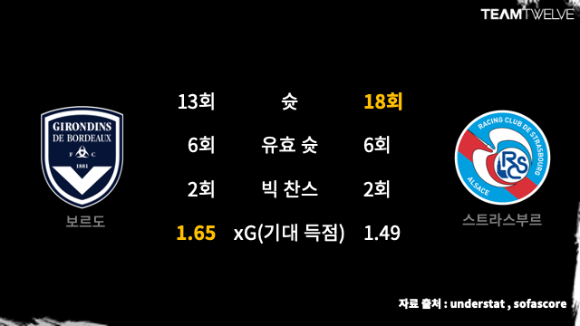 상대에 주도권을 다 내준 보르도였지만, 이상하게 공격에서만큼은 크게 밀리지 않았다. 사실 승부를 가르는데 중요한 데이터는 이 항목들이다. 앞선 데이터들은 경기의 흐름을 볼 수 있는 정도다. 데이터와 결괏값이 다를 수 있다. 이번 경기가 그랬다. 슛 횟수는 13 대 18로 보르도가 적었지만, 유효 슛 횟수는 오히려 같았다. 요컨대 공격 효율 면에서 보르도가 높았다.