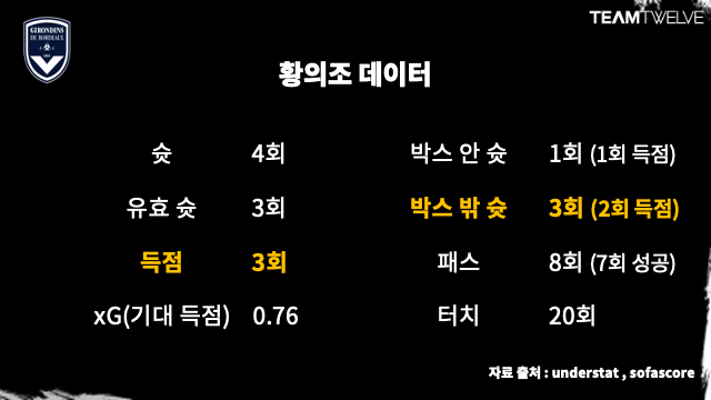 황의조의 기대 득점은 0.76으로 데이터는 그가 경기에서 1골 정도는 넣을 수 있었다고 보고 있다. 골 장면을 본 사람들이라면 납득할 것이다. 그만큼 그의 골 장면은 득점으로 연결되기 어려운 슛이었다. 그럼에도 보란 듯이 해트트릭을 하며 보르도를 위기에서 구해냈다. 정말 ‘HWANG-TASTIC’했던 황의조, 게다가 커리어 첫 유럽 무대 해트트릭까지. 매서운 성장세를 보이고 있는데, 이번 시즌 득점 기록이 어느 고지까지 향할지 지켜보는 것도 황의조를 바라보는 관전 포인트가 될 듯하다.