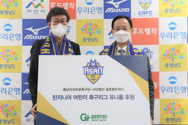 충남 아산(구단주 오세현, 이하 충남아산FC)은 지난 26일, 이순신종합운동장에서 (사)글로벌투게더(이사장 김교식)와 축구용품 전달식을 진행했다. 이날 전달식에는 충남아산FC 전혜자 대표이사와 (사)글로벌투게더 송금영 이사(前 탄자니아 대사) 등 관계자가 참석했다.