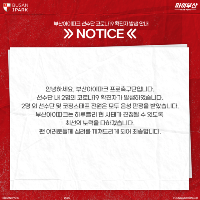 부산은 소셜 미디어를 통해 선수단 내 두 명의 코로나19 확진자가 발생했다고 팬들에게 전했다. 확진 판정을 받은 인원 이외 선수단 및 코칭스태프 전원은 다행히 모두 음성 판정을 받았으며, 부산은 하루 빠릴 현 사태가 진정될 수 있도록 최선을 다하겠다는 다짐을 남겼다.