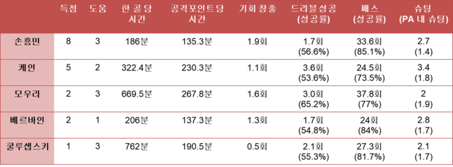 득점과 도움, 한 골을 터뜨리는 데 걸린 시간, 공격 포인트 하나를 기록하는 데 걸린 시간, 기회 창출 횟수(이하 90분 기준), 드리블 성공 횟수 및 성공률, 패스 횟수 및 정확도, 페널티박스 내 슈팅 횟수 등 총 8개 부문 수치를 비교했다.