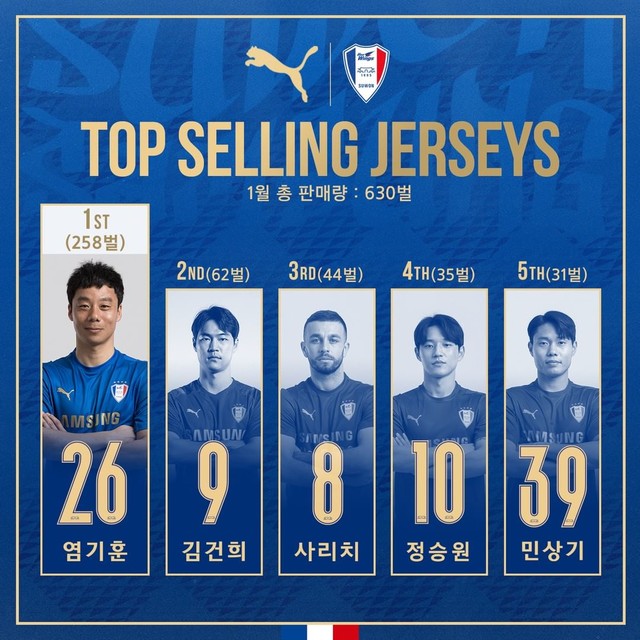 수원 삼성이 1월 한 달 동안의 유니폼 판매량 순위를 공개했다. 1위부터 5위까지 TOP 5에 속한 다섯 명, 그리고 유니폼 판매 수량도 함께 공개했다.