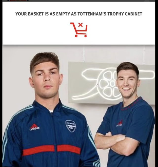 최근 아스널 온라인 스토어에서 장바구니가 빈 상태로 클릭했을 때 ‘당신의 바구니가 토트넘 트로피 진열장처럼 비었다’라는 문구가 확인됐다.