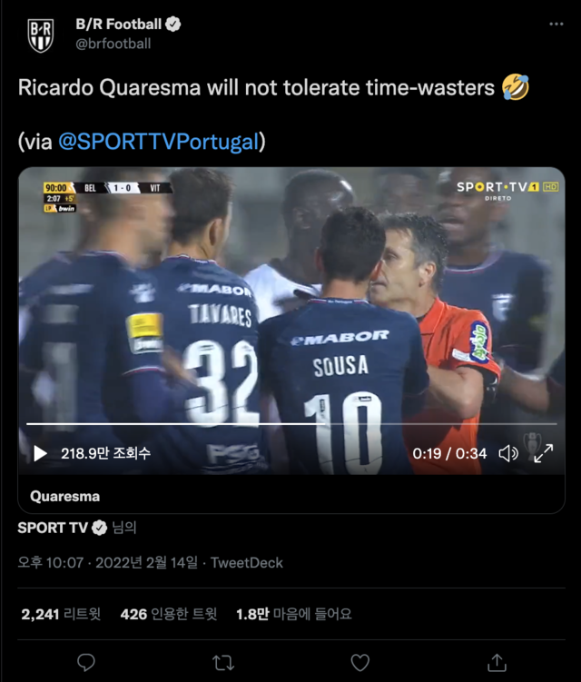 과거 첼시와 바르셀로나에서 뛰었던 콰레스마는 현재 포르투갈 비토리아 소속이다. 이 경기에서 비토리아는 리그 최하위 벨레넨스스에 0-1로 패배했다.