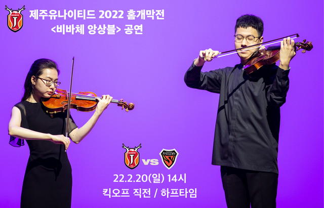 제주의 2022시즌 홈 개막전 상대는 포항 스틸러스다. 오는 2월 20일 오후 2시, 제주 월드컵경기장에서 맞붙는다. 이날 제주는 ‘울림 있는 하모니’를 준비했다. 제5회 전국 발달장애인 음악축제(Great Music Festival)에서 대상(문체부장관賞)을 수상한 ‘비바체 앙상블(바이올린·비올라 듀오)’을 초청한다.