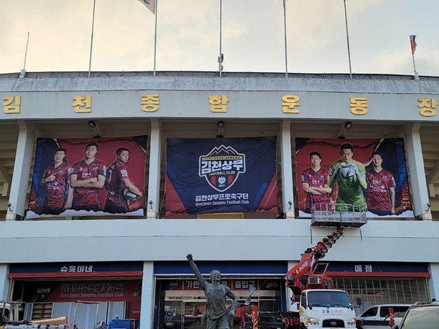 김천 상무는 오는 27일 오후 2시 김천 종합운동장에서 하나원큐 K리그1 2022 2라운드 포항 스틸러스전을 치른다. 김천은 홈 개막전을 앞두고 경기장 안팎을 새 단장했다.