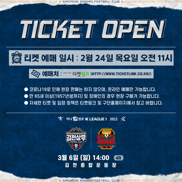 김천 상무가 3월 6일 FC 서울과 홈경기 티켓을 24일 오전 11시 티켓링크를 통해 예매 오픈한다.